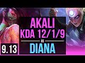 AKALI vs DIANA (MID) KDA 12/1/9, Godlike