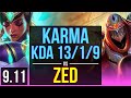 KARMA vs ZED (MID) KDA 13/1/9, Legendary