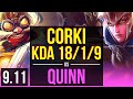 CORKI vs QUINN (MID) KDA 18/1/9, Legendary