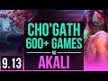 CHO'GATH vs AKALI (MID) 3 early solo kills, 600+ games